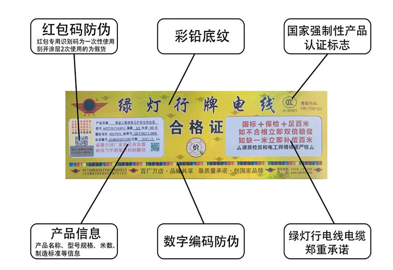 綠燈行電線產品合格證的編碼暗紋防偽標識,同時具有防偽紅包碼用以掃描查詢辨別真假。