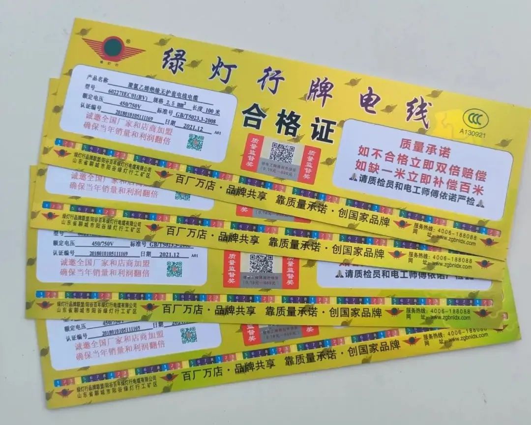 綠燈行現行的防偽合格證,經過多重技術處理、多重考證,是杜絕造假、保護消費者權益的極為有效的手段。請廣大銷售商和消費者留心留意、擦亮眼睛!凡是自行打印的合格證、檢驗報告都是假的。凡是與本文圖示不相符的電線電纜合格證,都涉嫌造假。請及時與廠家聯系!