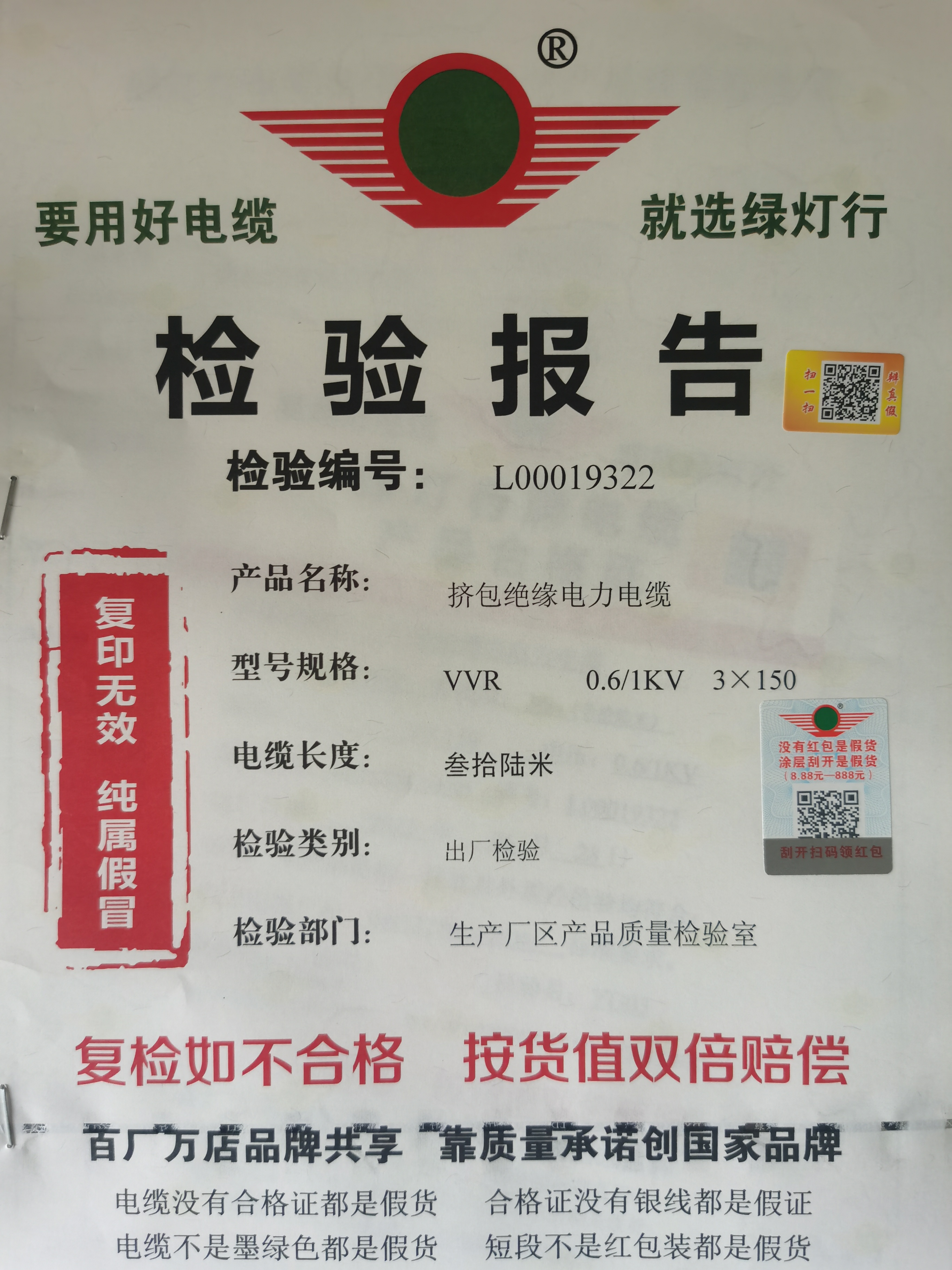 綠燈行電線電纜檢驗報告與合格證均有銀線暗紋(彩纖),否則為假冒偽劣產品。